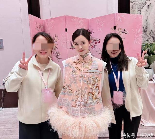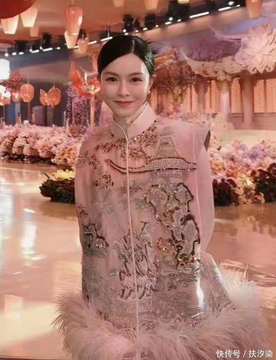 她穿了一身重工的中式粉色刺绣套装,内搭同款色系的立领旗袍,显得格外有质感。 尤其是外搭的无袖马甲,上面用金银线绣的花鸟图案又多又精致,下摆还挂着同色的羽毛穗子,细节满满。